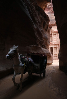 Ah, the rose-red city appears at the end of the gorge. Such a beautiful entrance to this ancient city that is literally carved into the red sandstone desert cliffs. The way the light filters through the tall canyon, reflecting the colors of the rocks. The way the gusts of wind come around corners like they’re being chased by a giant boulder from Indiana Jones. The thunderous sound of the horse hooves pulling chariots that, as they approach, you aren’t sure which way they are coming from until they are nearly upon you and you’re leaping out of the way to let them pass. The prevalence of rock paintings and aqueducts fixed high on the walls by an ancient civilization. It is alive with history. And then, when you’re so engrossed in the Siq itself and nearly forget why you’re there, the great facade of the Treasury begins to reveal itself at the end of the canyon.